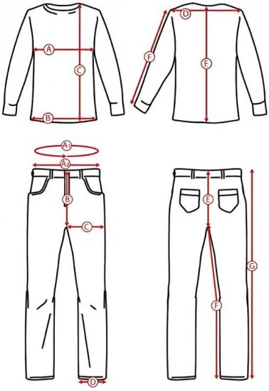 | Pants | A1 | A2 | B | C | D | E | F | G |