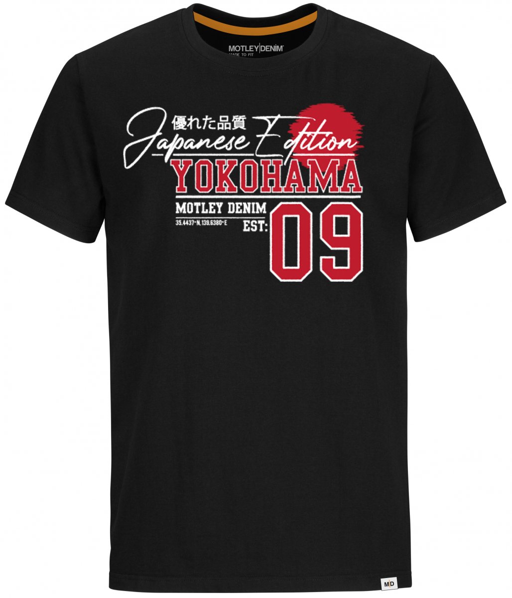 Frissítsd fel alkalmi kollekciódat ezzel a Motley Denim nagyméretű pólóval. Kényelmes, 100% pamut anyagból készült, fekete színű, klasszikus, rövid ujjú nyakkivágással és japán stílusú "Yokohama 09" grafikai nyomtatással a mellkasán. Annak érdekében, hogy szép maradjon, 30 fokon ajánlott mosni. Párosítsd kedvenc farmereddel és edzőcipővel egy hétvégi laza megjelenéshez.