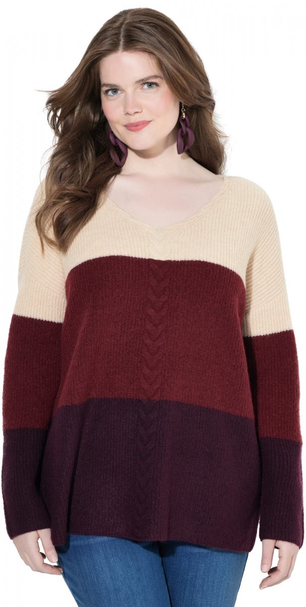 Mérettáblázat - Ulla Popken Cable Knit Block Stripe V-Neck Sweater Dark Ruby