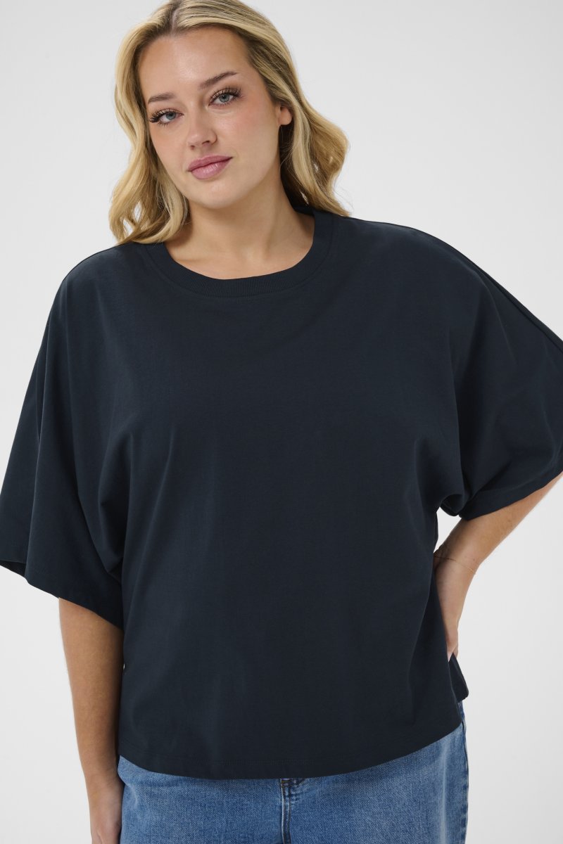 PólóElérhető S–XL méretekbenA Kaffe Curve márkától100% pamut anyagból készültBő szabásSzín: TengerészkékKattintson ide a mérettáblázat megjelenítéséhez.