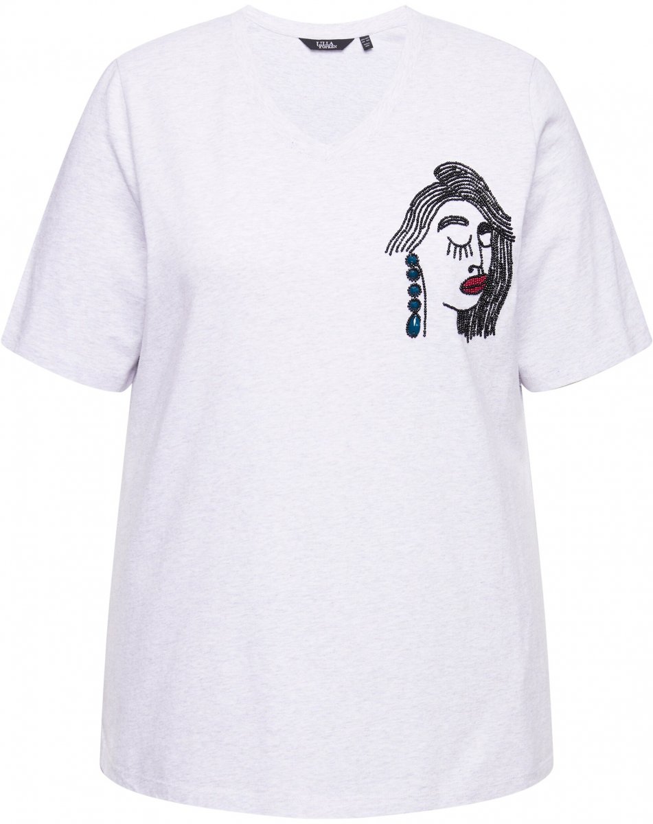 Mérettáblázat - Ulla Popken Embroidered Face Motif Short Sleeve V-Neck Tee Light Grey Melange