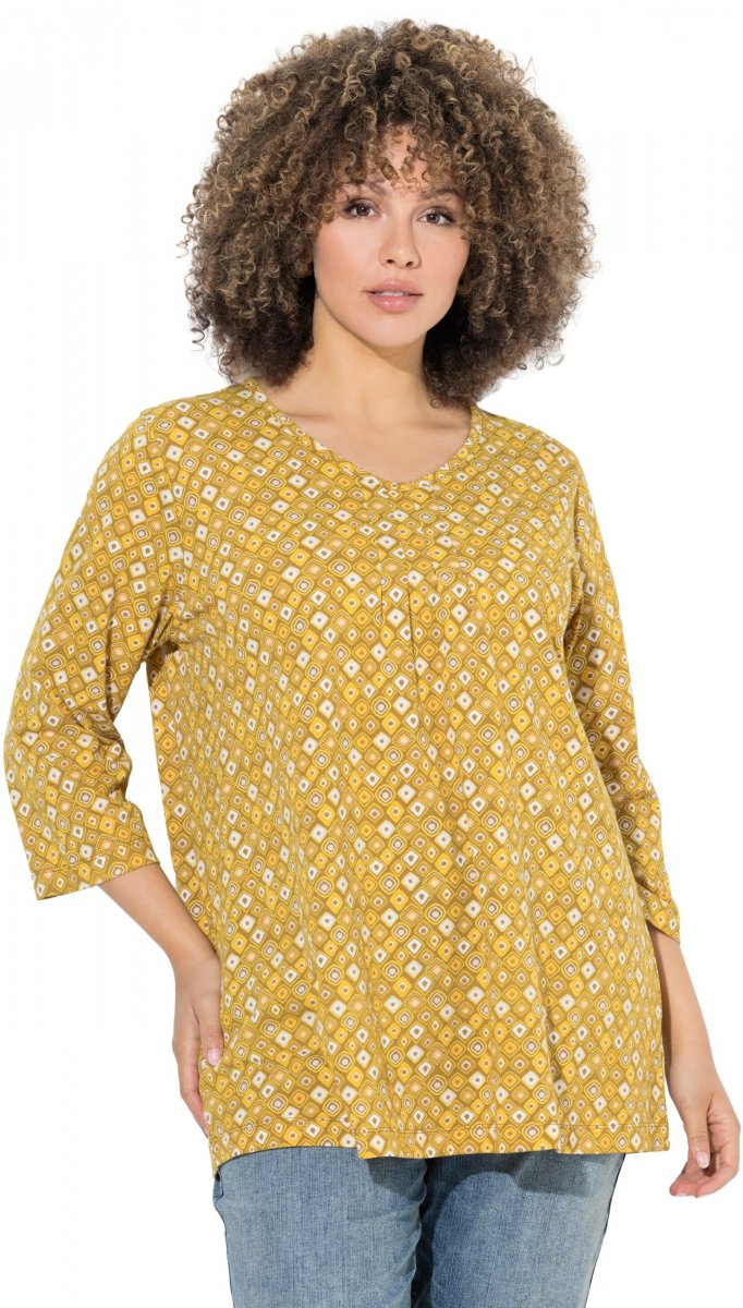 Ulla Popken Graphic Print Pleated 3/4 Sleeve Tee Mocha Brown