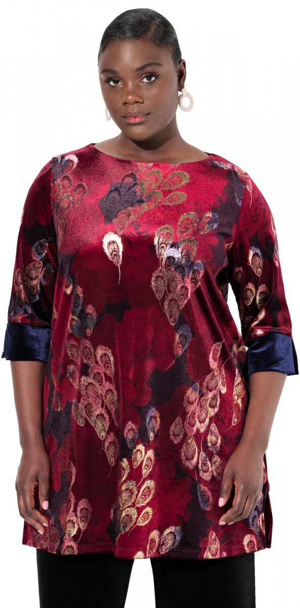 Ulla Popken Velvet Peacock Feather 3/4 Sleeve Tunic Blouse Wine Red